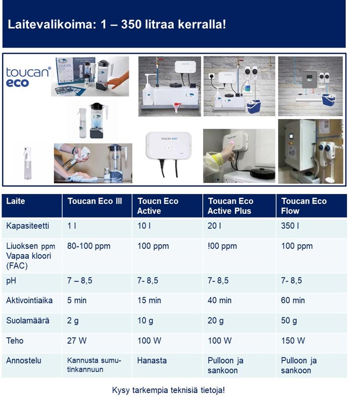 Toucan Eco Flow -laitteessa kestää tunnin valmistaa 350 litran erä liuosta. Sen jälkeen Flow- malli tekee liuosta automaattisesti, kun se saavuttaa 50%:n kapasiteetin, joten se on hanasta valmis annosteltavaksi ruiskupulloihin tai astioihin.