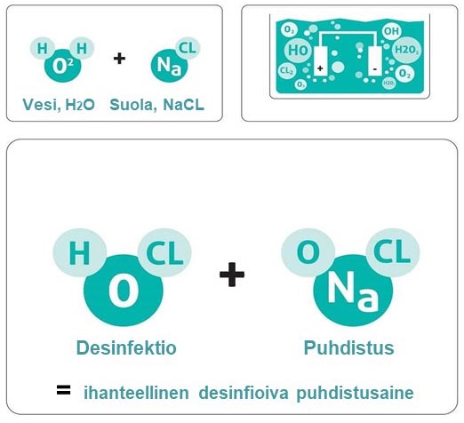 Elektrolyysin aikana positiivisessa anodissa suolassa oleva kloridi (Cl) (NaCl) yhdistyy vedessä olevan vedyn (H) ja hapen (H) kanssa (H2O) ja luo hypokloorihappoa (HOCl), joka on voimakas, mutta turvallinen desinfiointiaine. Negatiivisen katodin vaikutuksesta suolan (NACl) natrium (Na) ja kloridi (Cl) yhdistyvät hapen (O) ja kloridin (Cl) kanssa, jolloin muodostuu natriumhypokloriittia (NaOCl), joka on hyvin pieni valkaisuainepitoisuus. Tämä ja lempeä emäksinen pH-arvo välillä 7,8–8,5 antavat liuokselle puhdistusominaisuudet.
