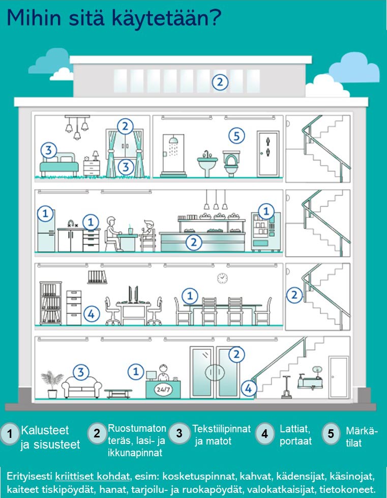 Kyllä. Se on todistetusti tehokas desinfiointi- ja puhdistusliuos, jolla on erittäin korkea mikrobien tappoaste (99,999%), nopea kosketusaika ja uudelleenkasvua vähentävä vaikutus. Liuos on myös mieto pinta-aktiivinen aine, joka tarjoaa puhtaat, tahrattomat pinnat.