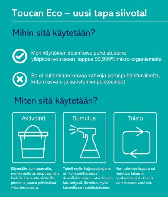 Toucan Econ tuottama valmiste on tehokas desinfiointiaine ja mieto puhdistusaine, joten se korvaa yleiset desinfiointiaineet, ylläpitosiivouksen aineet, keittiö-, kylpyhuone- ja WC-tilojen puhdistusaineet, lasi- ja metallipuhdistusaineet sekä hajunpoistoaineet.