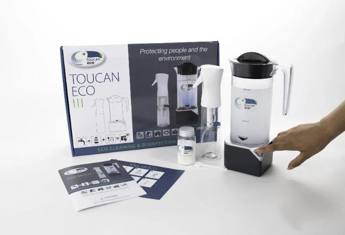 Toucan Eco- aktivointilaite tekee monikäyttöisen puhdistus- ja desinfiointiaineen vesijohtovedestä ja ruokasuolasta sähkökemiallisen aktivoinnin (elektrokemiallinen aktivointi, ECA) avulla.